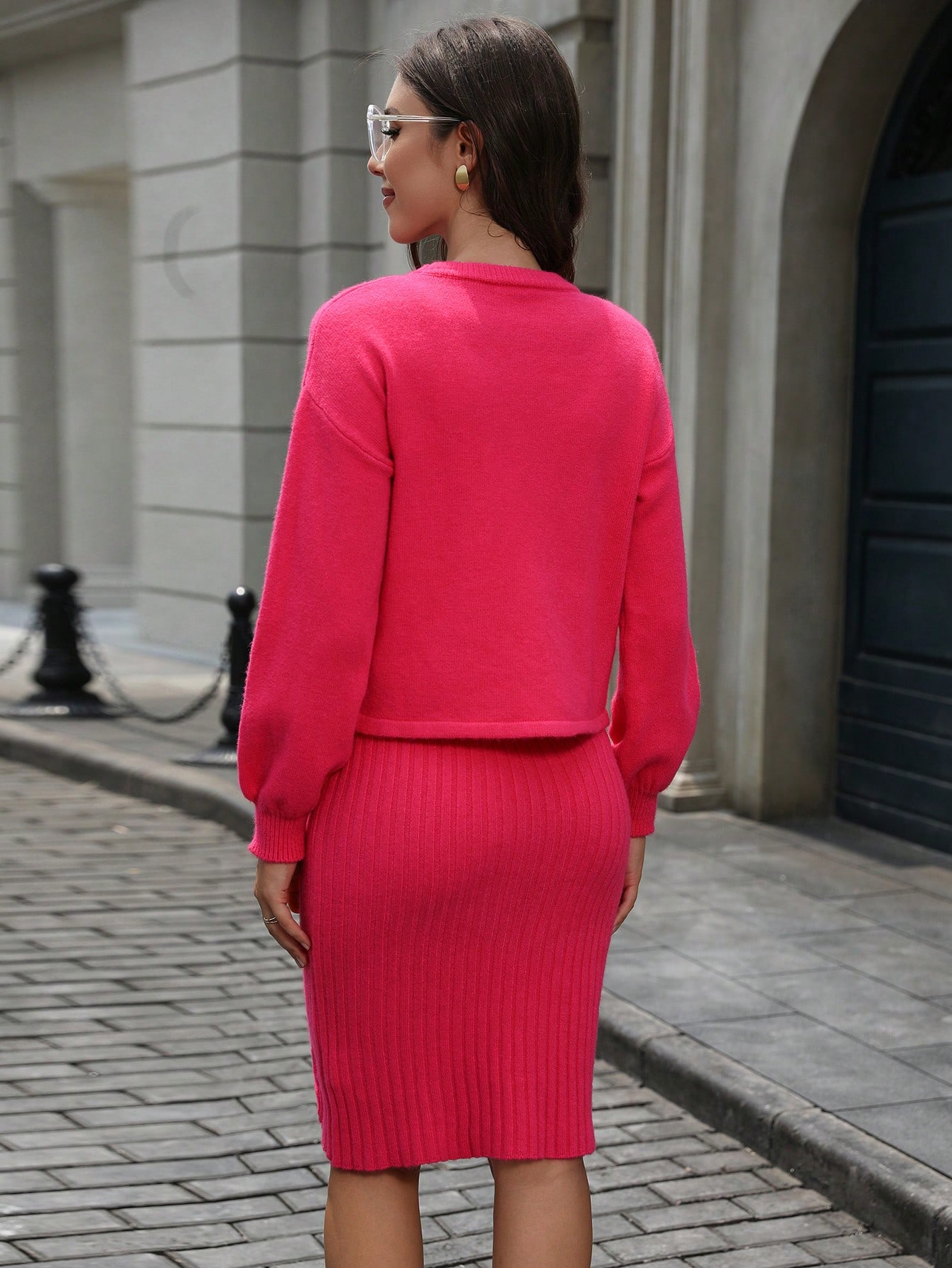 2pcs Noble Lady Style Round Neck Beaded Knitted Top And Knitted Slip Dress Ladies Sweater Set
