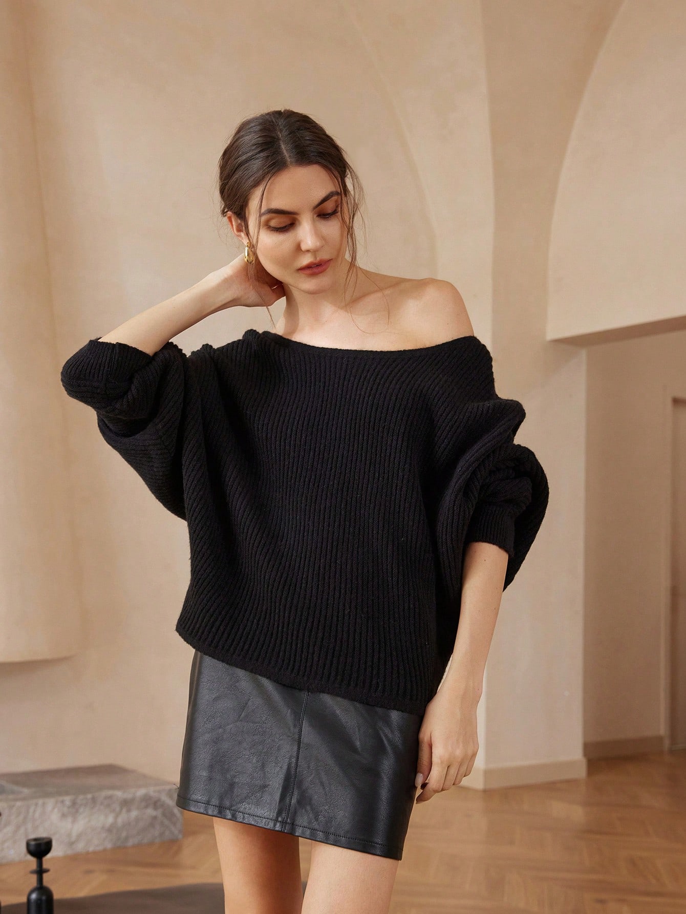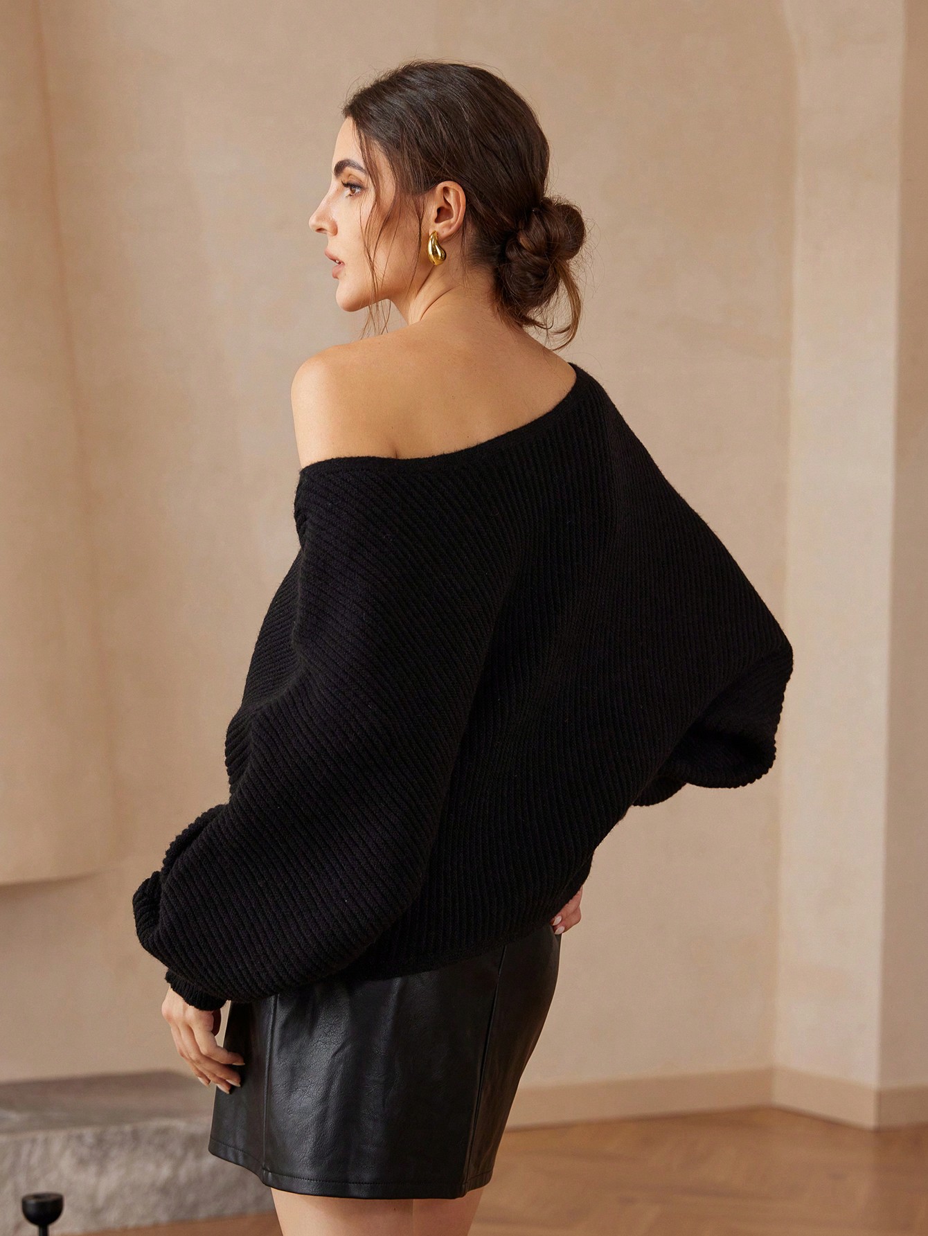 Black Casual Fashionable Asymmetrical Shoulder Design Long Sleeve Sweater