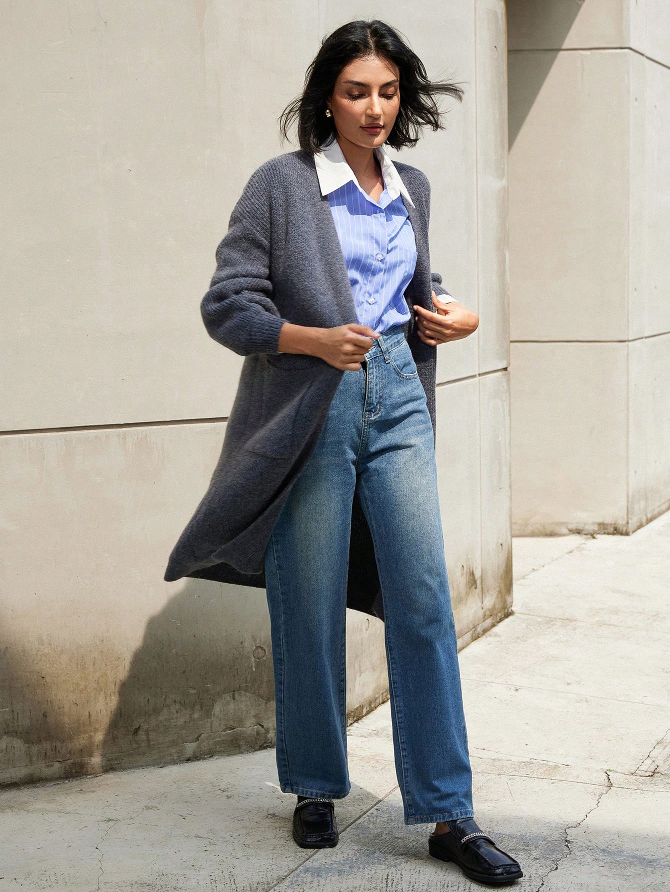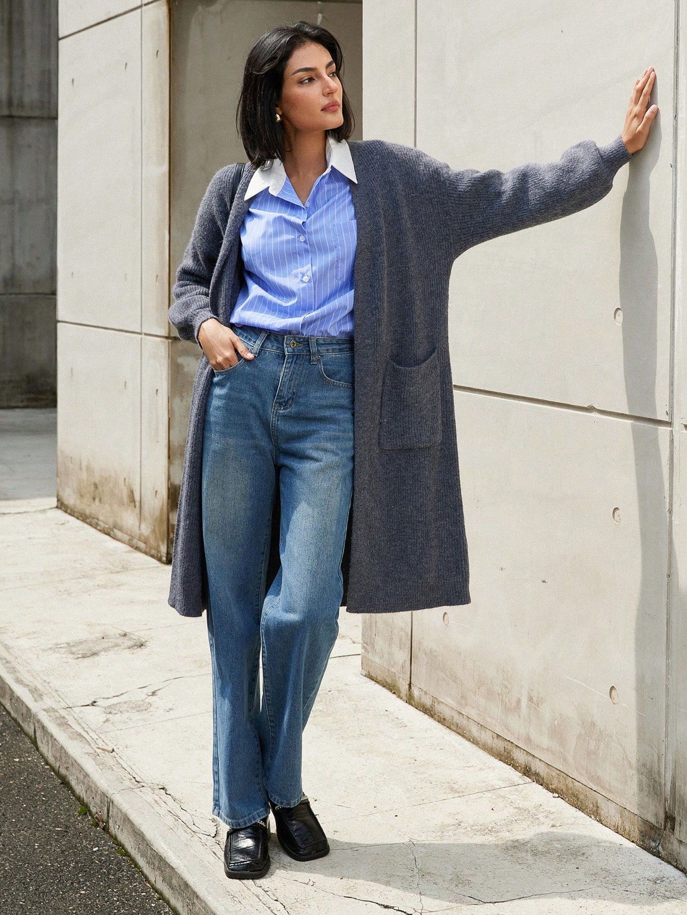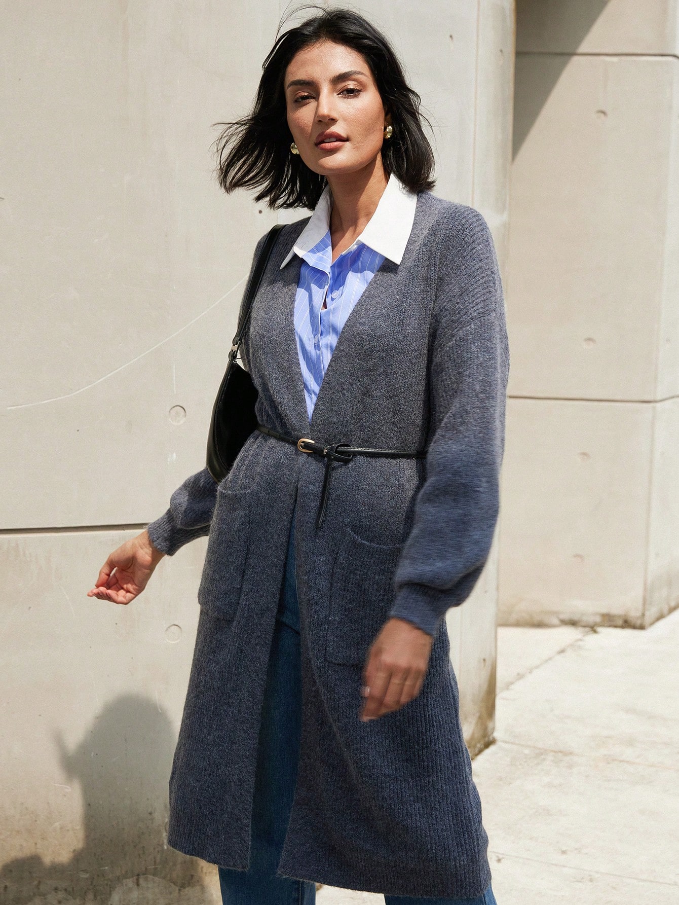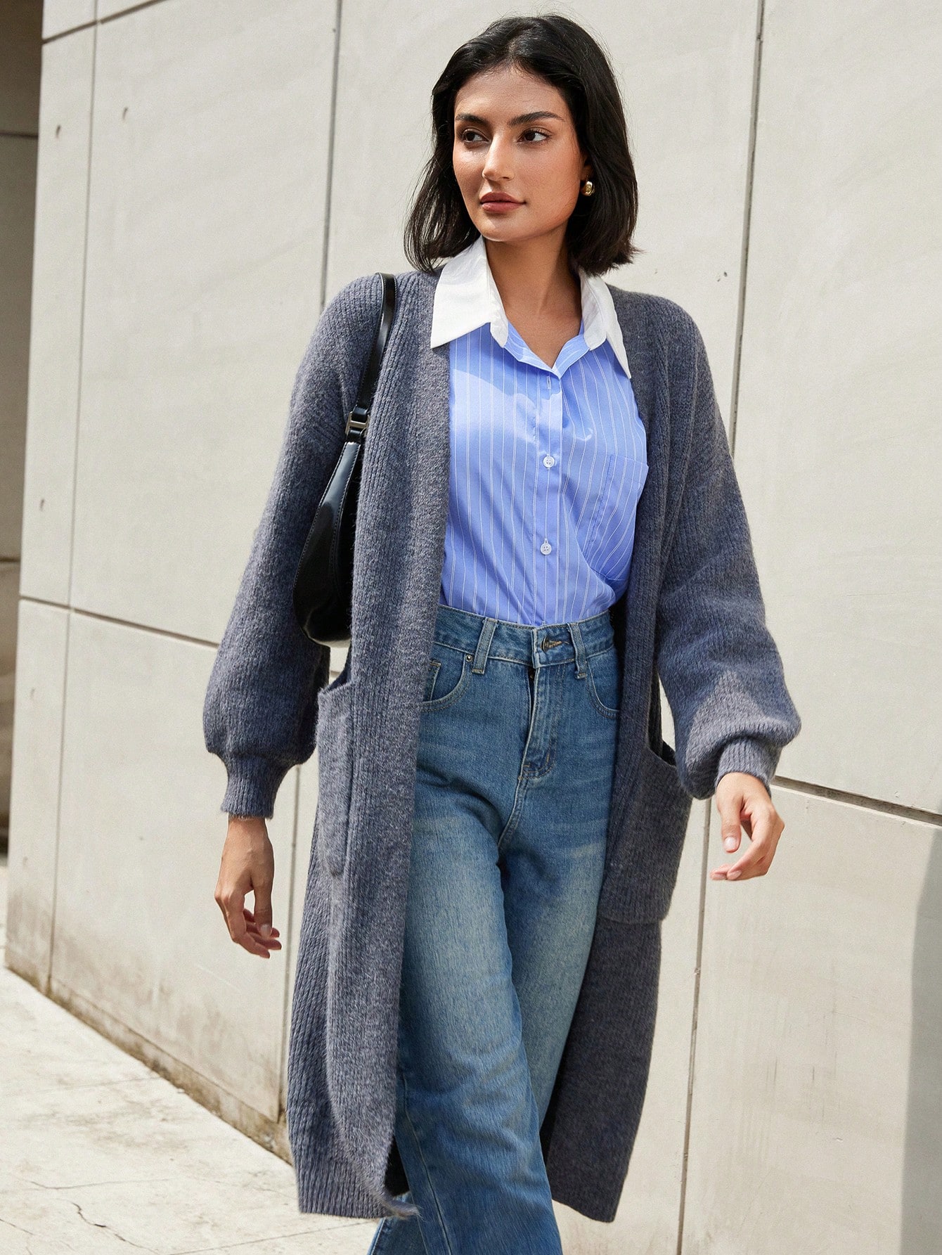 Casual V-Neck Solid Color With Pockets Long Sleeve Long Cardigan