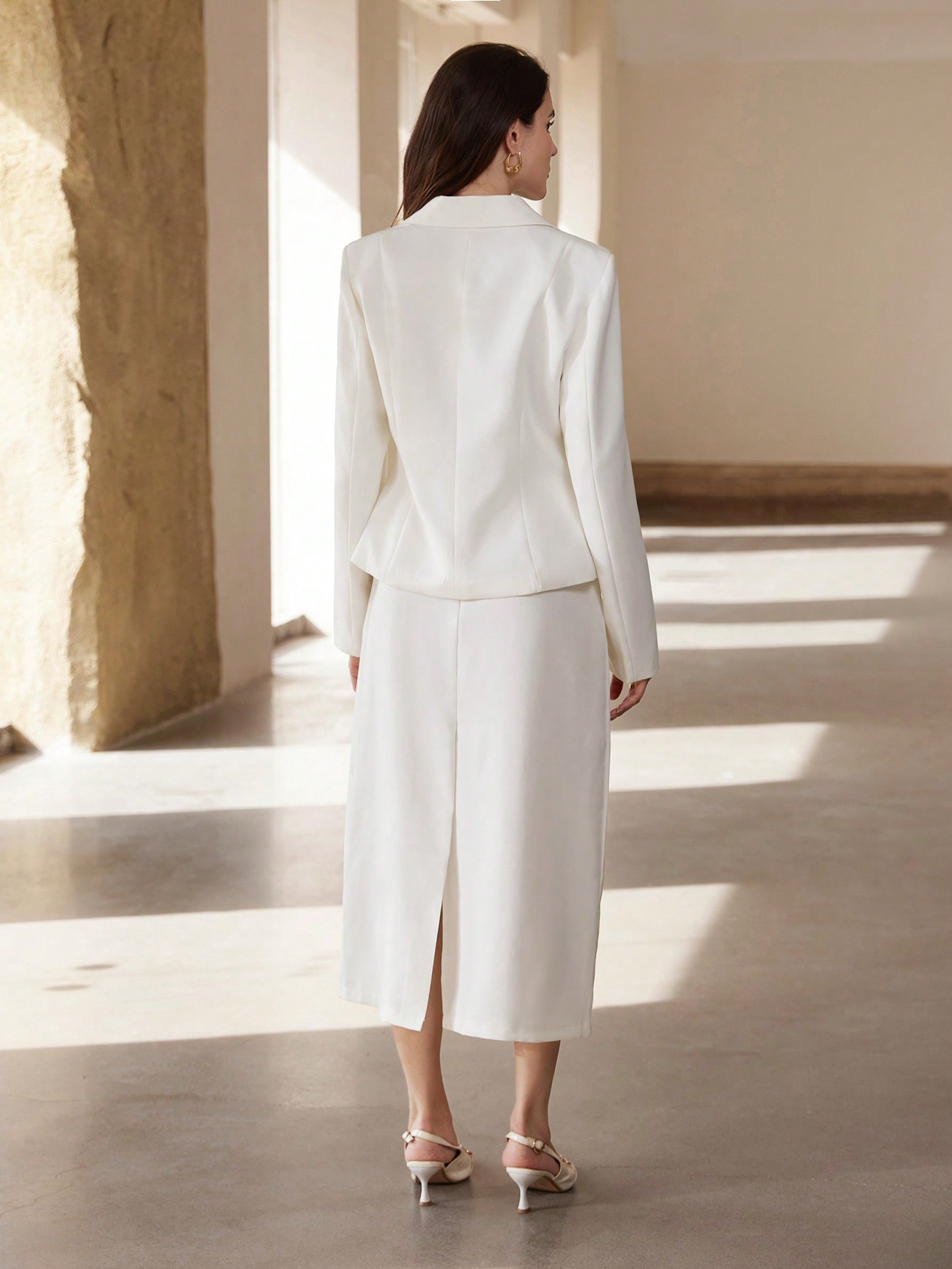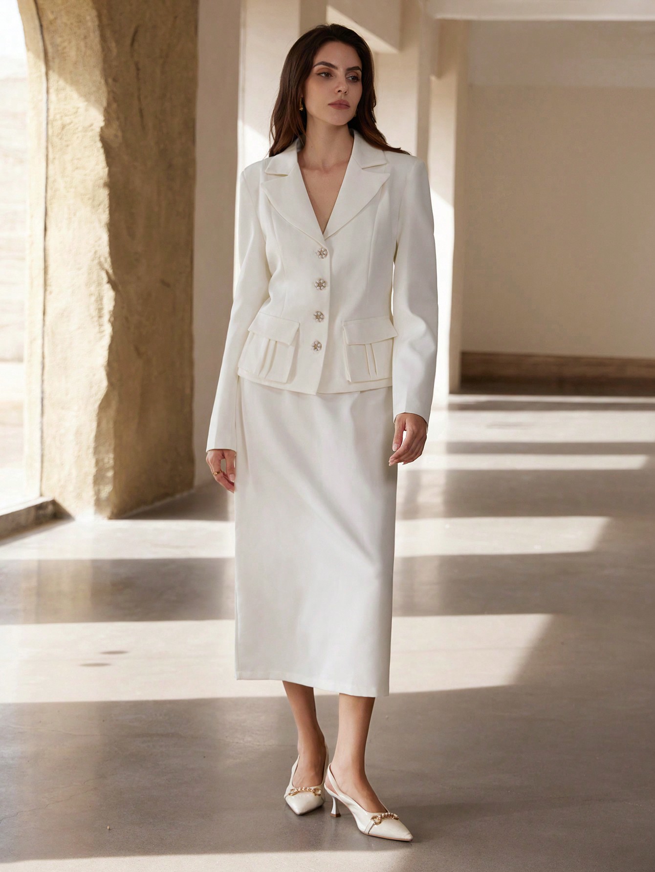 Elegant French Buttoned Blazer With Refined Long Pleated Skirt Suit Set, Chic Design