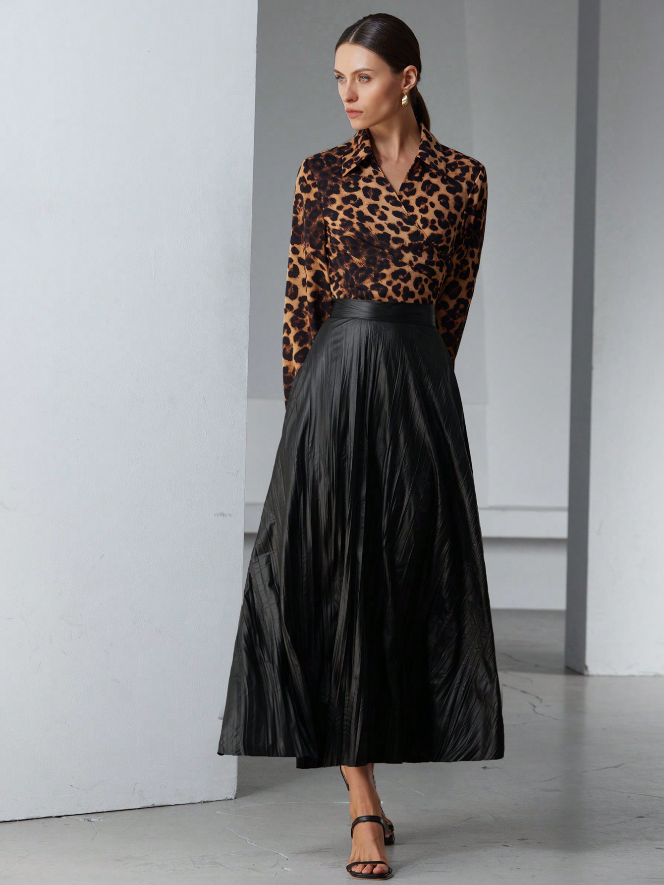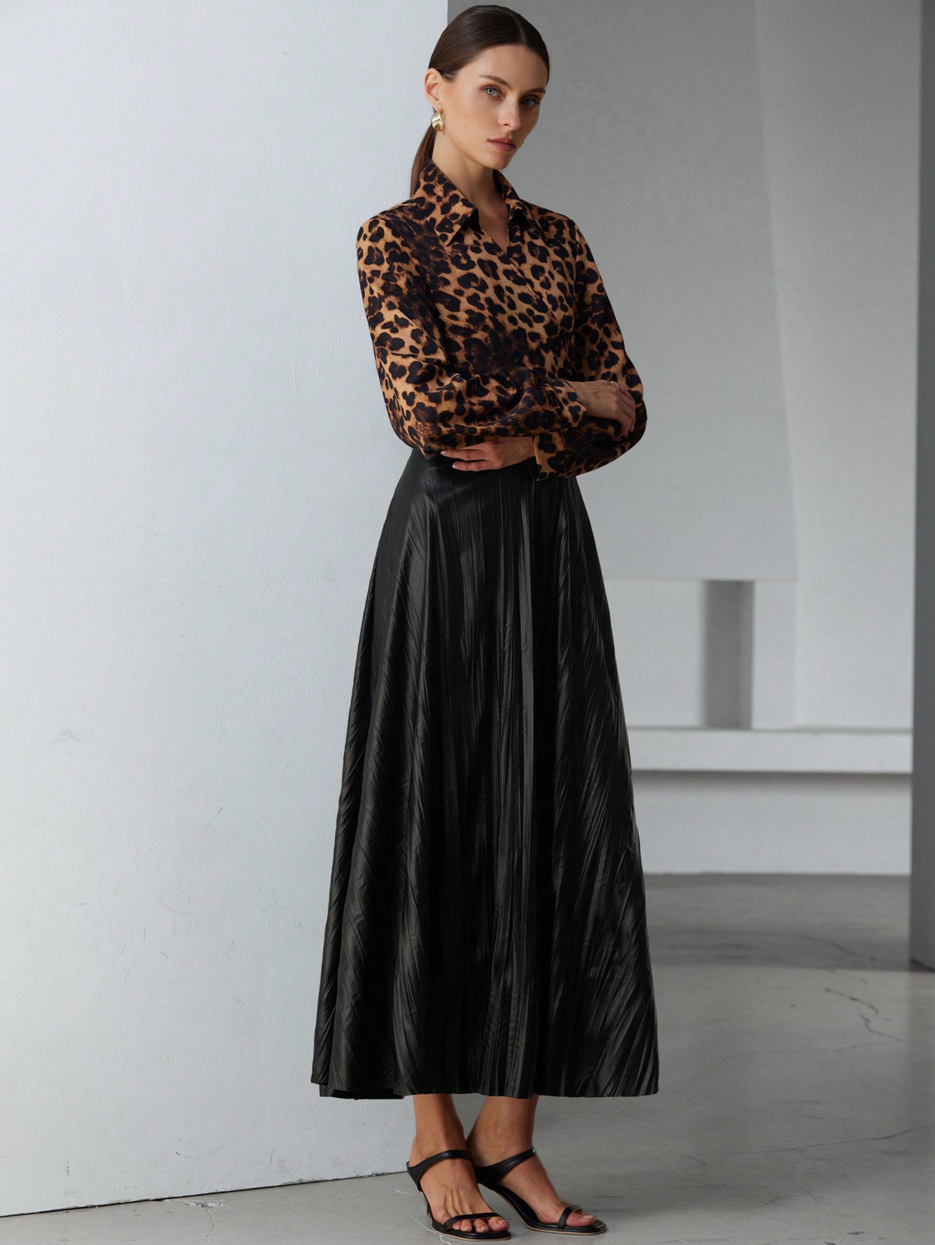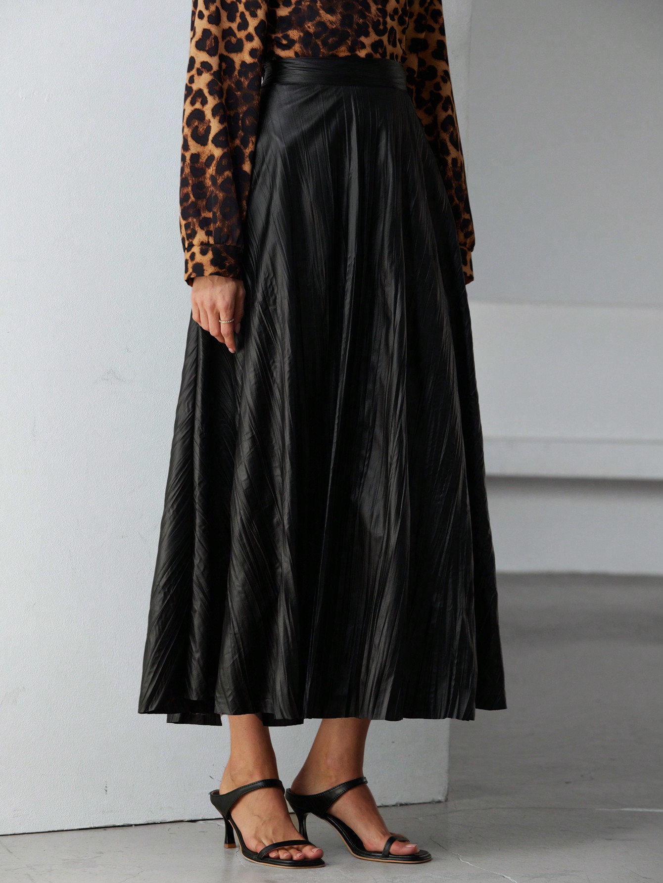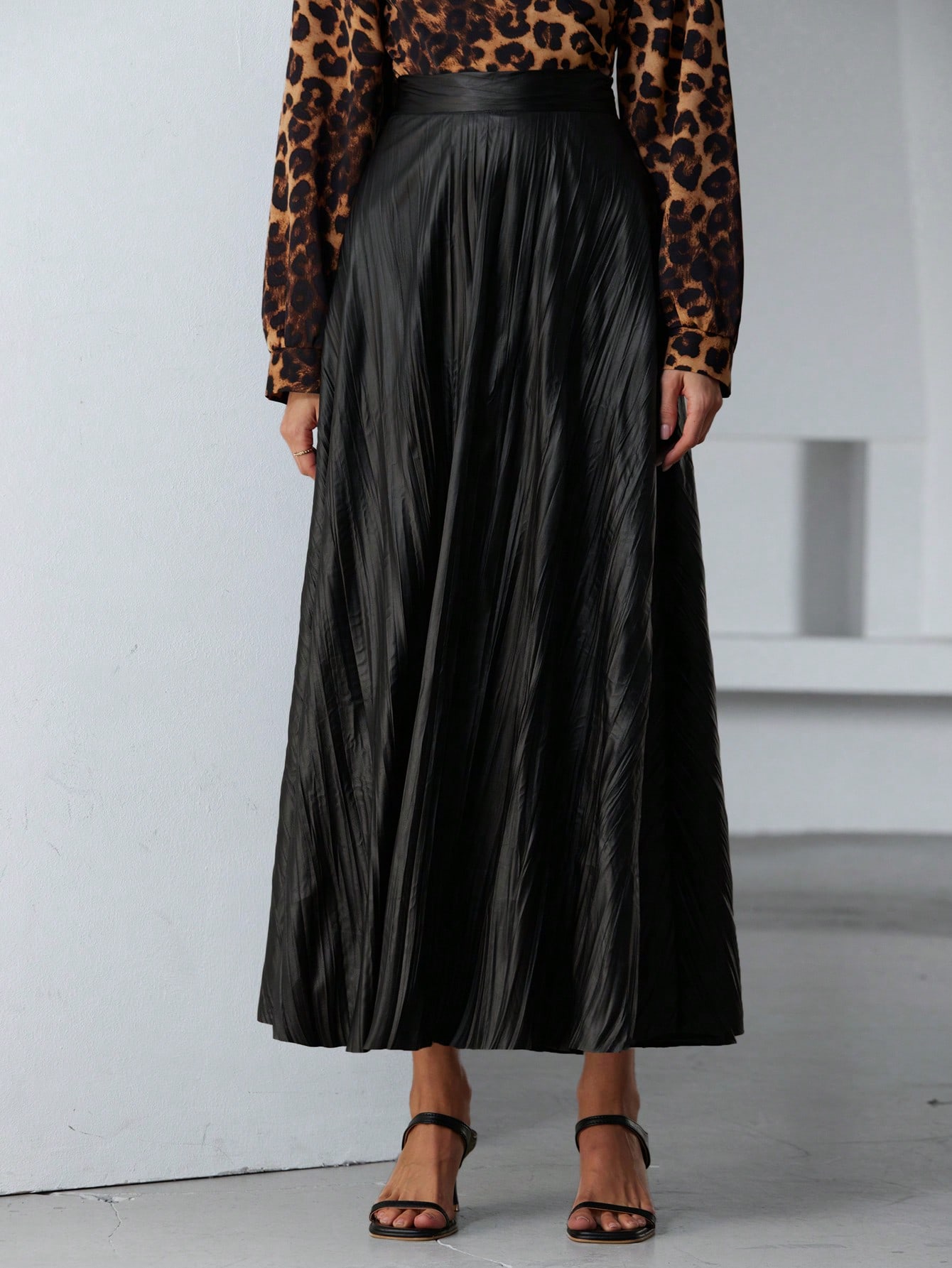 • French Elegant High-End Minimalist Faux PU Pleated Ruffle Hem Women Long Skirt