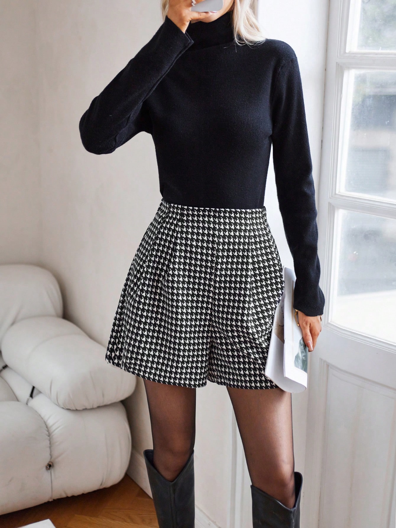 • Houndstooth Print Fold Pleated Detail Wide Leg Shorts
