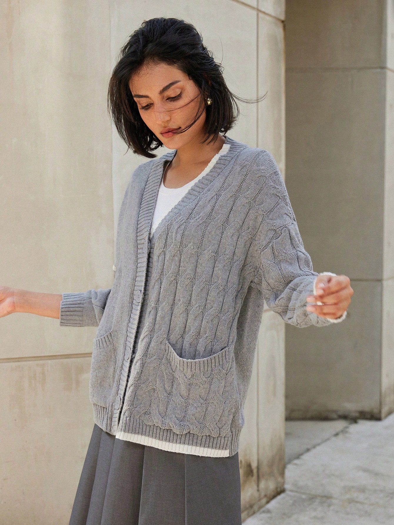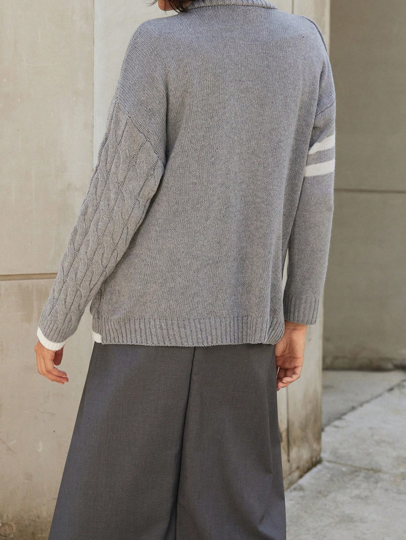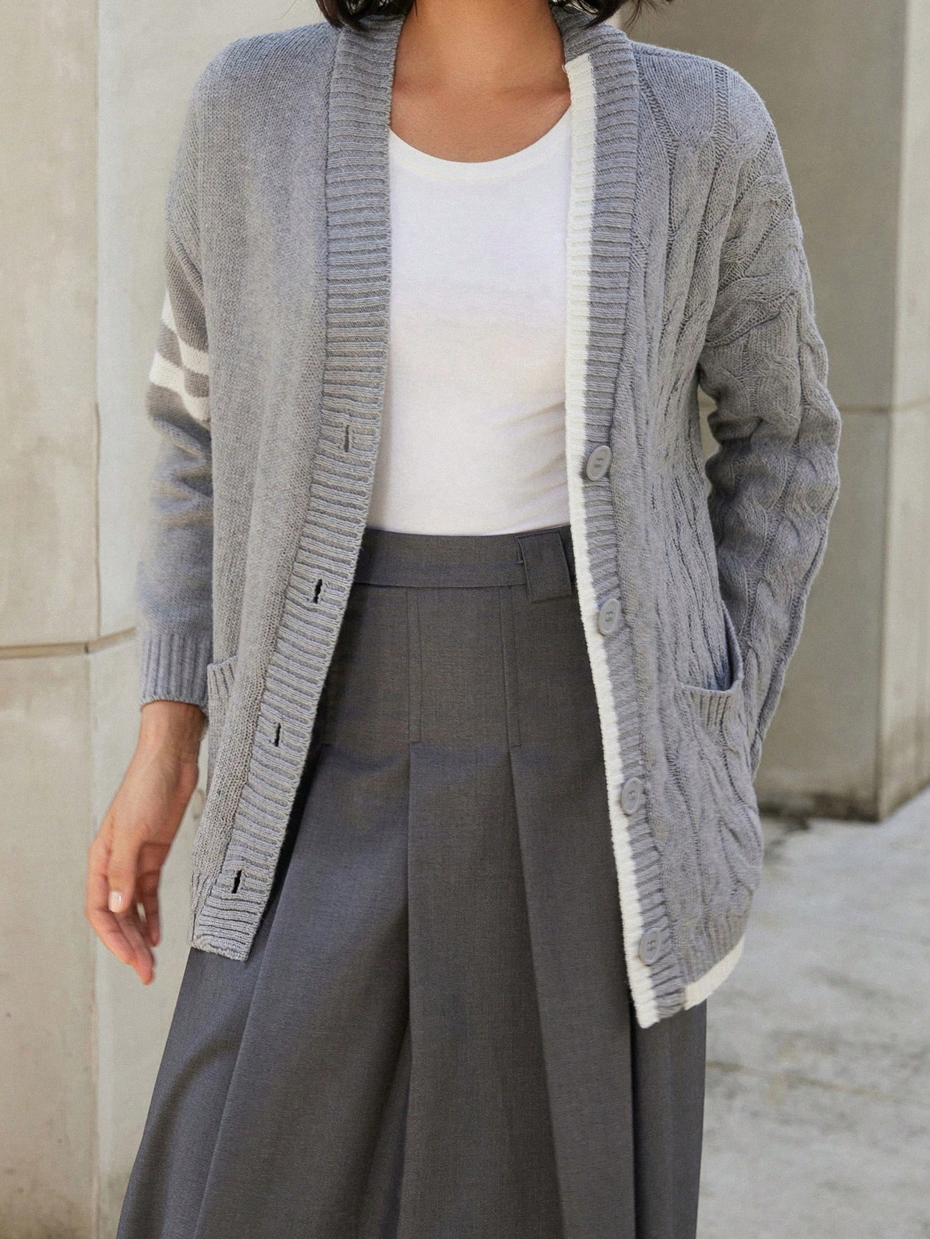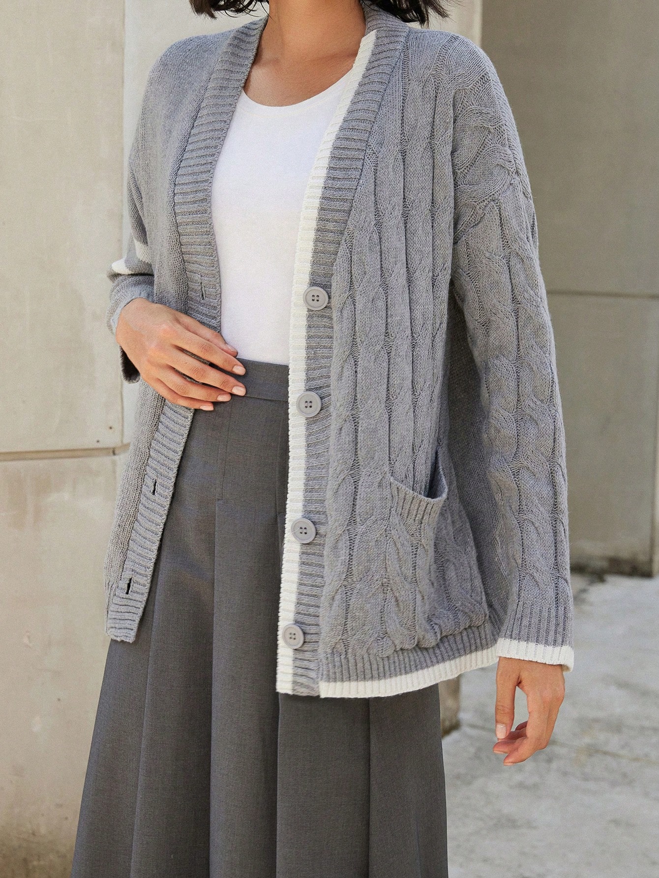 V-Neck Casual Striped Contrasting Color Loose Cable Knit Cardigan Sweater For Women