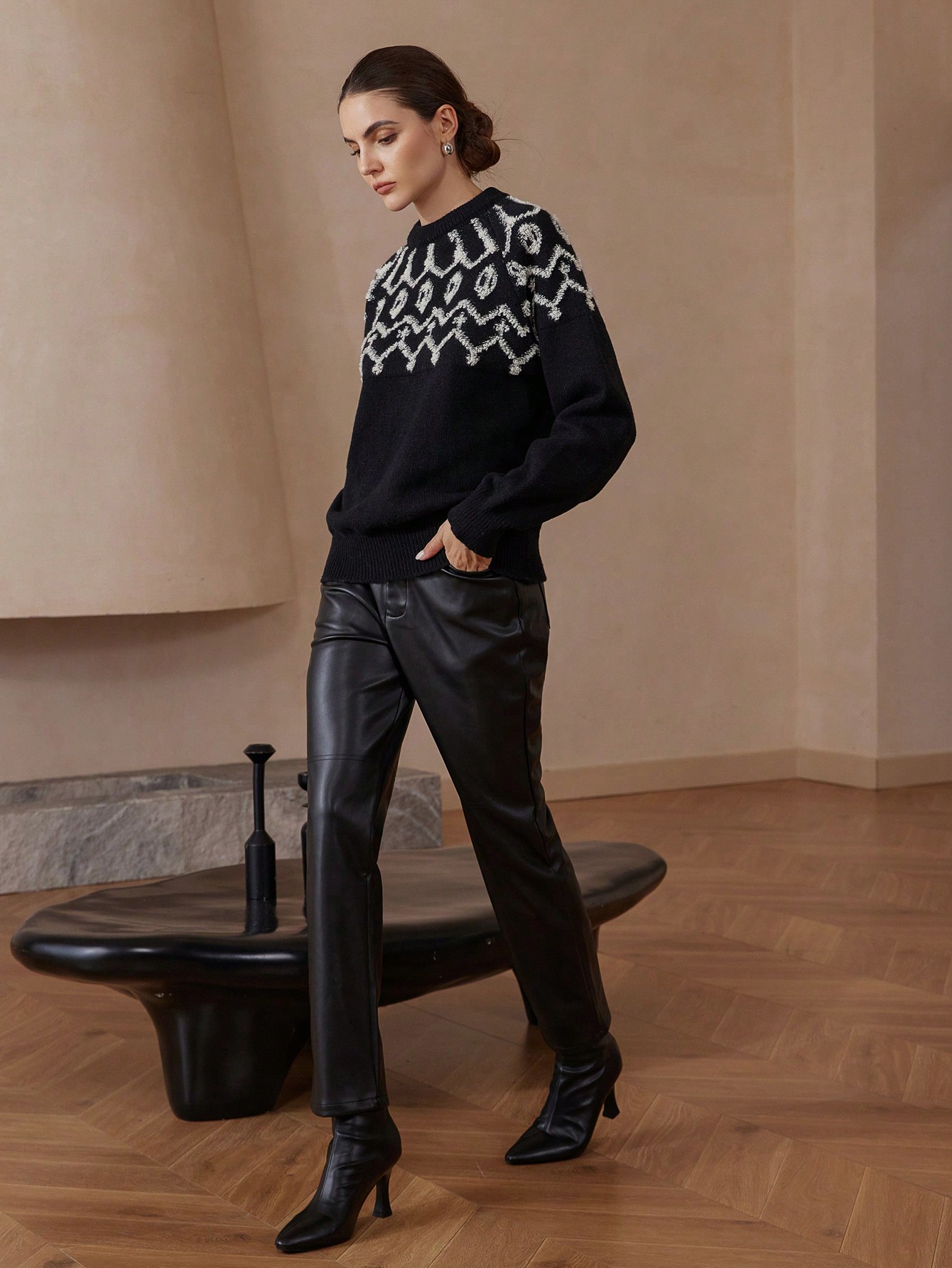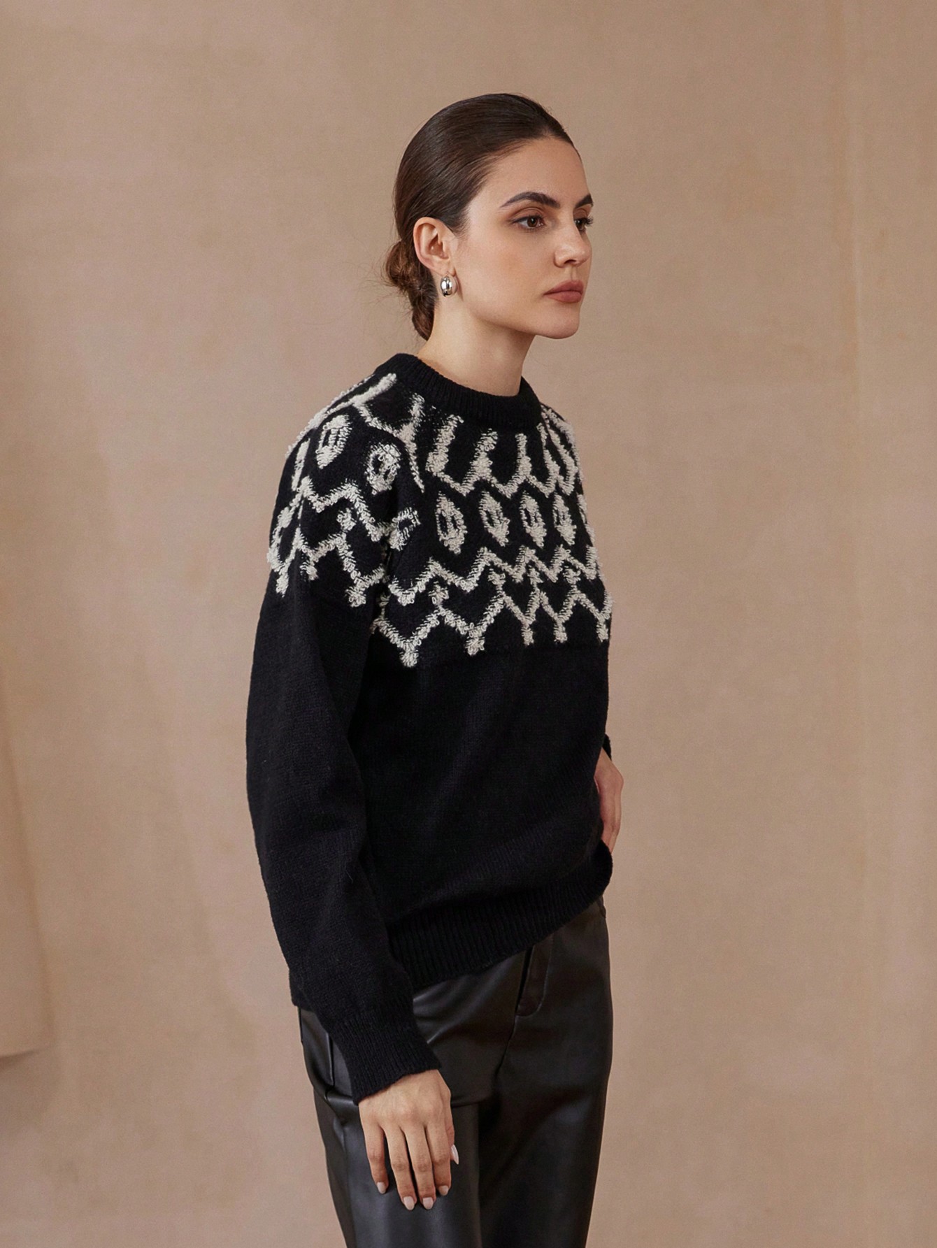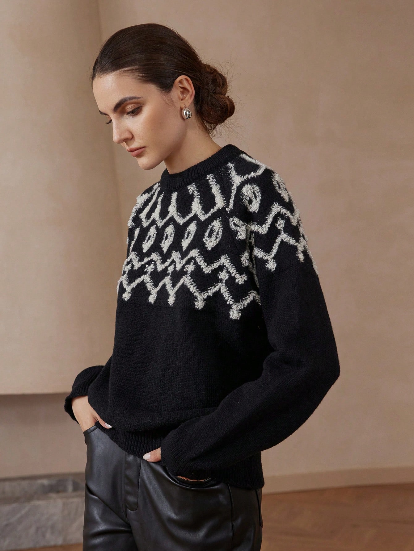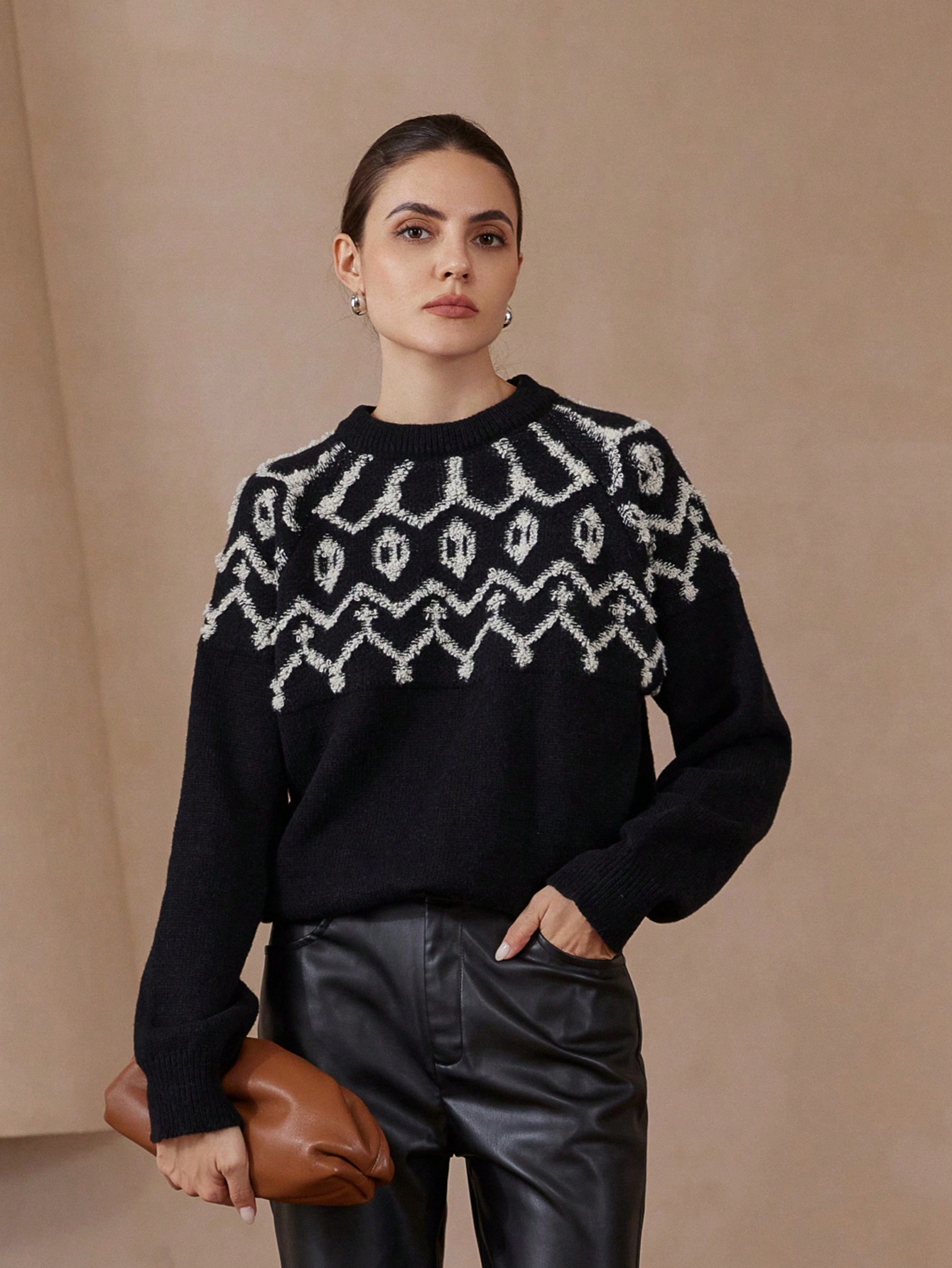 • Vintage Patterned Jacquard Stand Collar Loose Long Sleeve Sweater