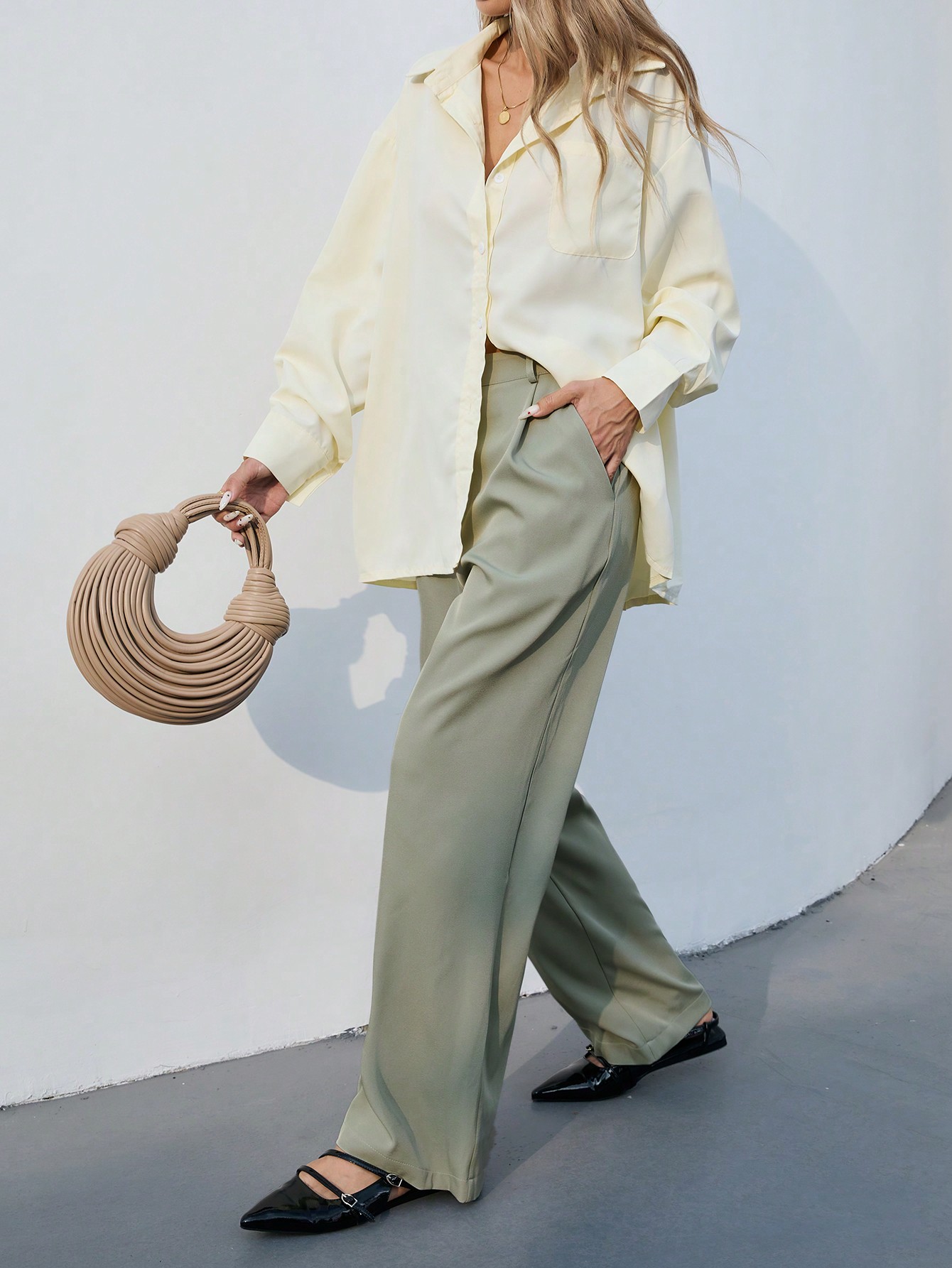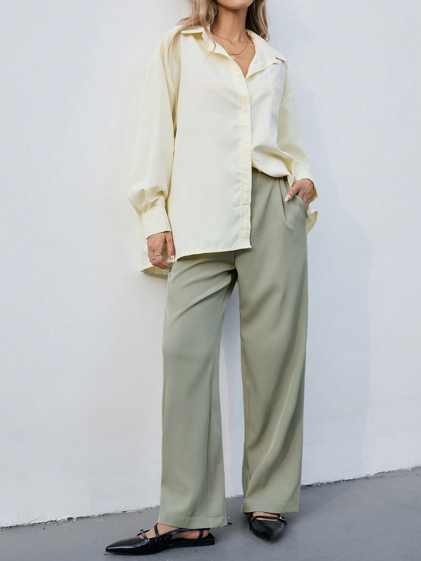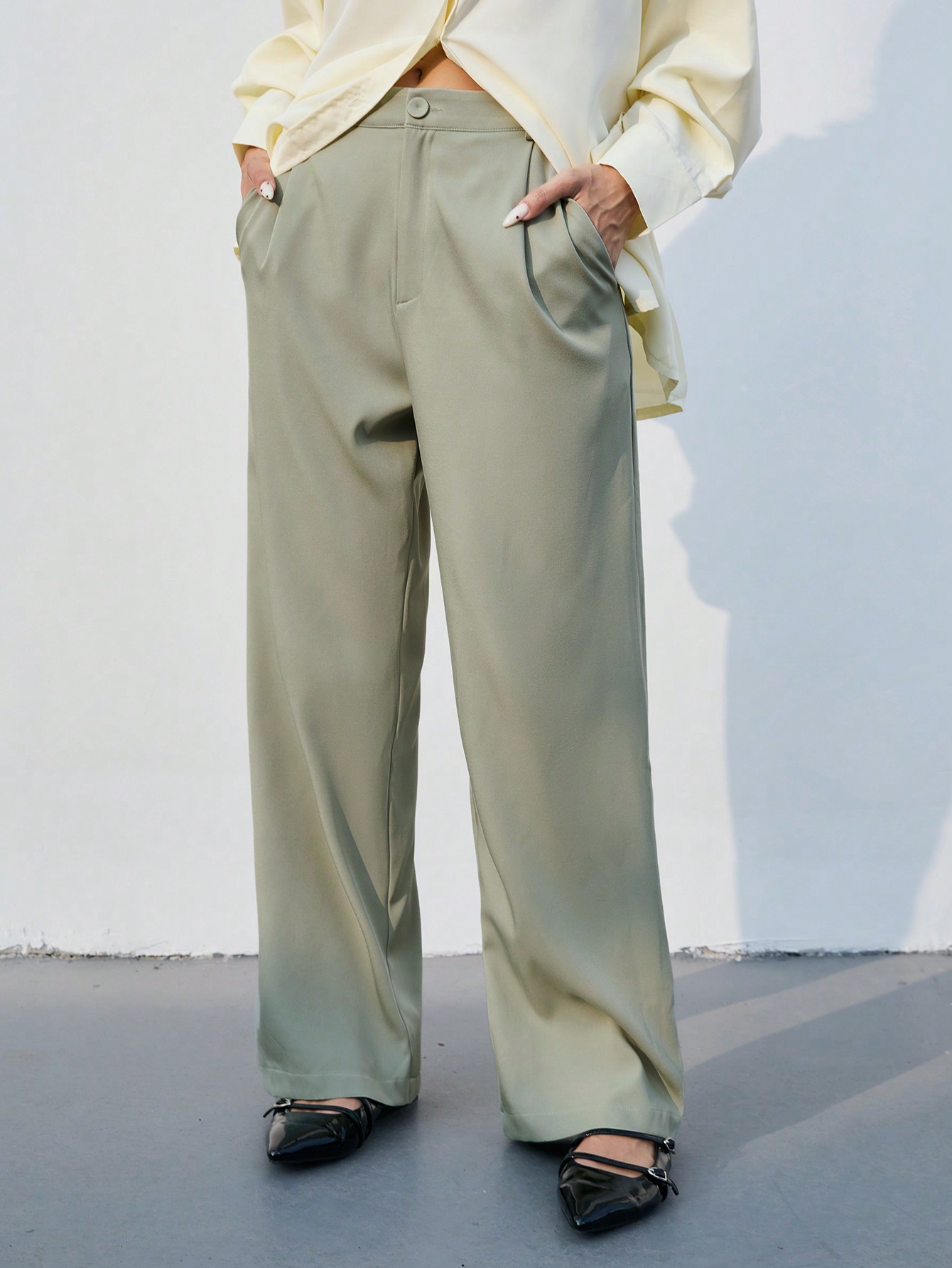 • Women's Solid Color Pleated High Waist Straight Leg Wide Leg Pants, Casual